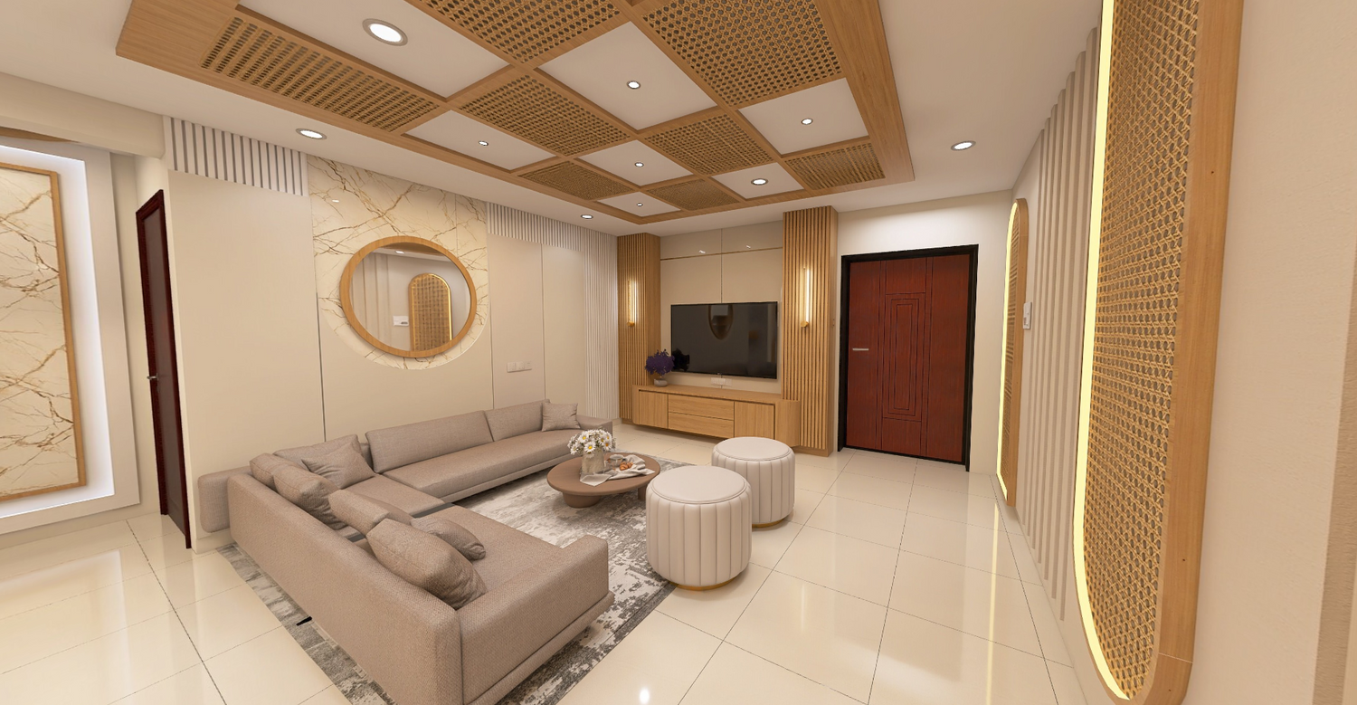 Our Theme Based Project at Ambience Courtyard, Manikonda, Hyderabad. This home design blends modern style with warmth by using a combination of white, cream, wood, and marble. Rattan sheets add a unique texture, while circles and rectangles inspire the shapes throughout the space. The result is a home that feels both elegant and inviting, offering a perfect balance of comfort and style.